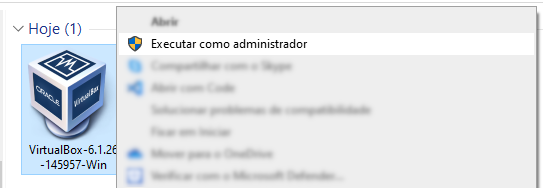 Execução como instalador Abra a pasta Downloads de seu computador, clique o botão direito do mouse sobre o arquivos de instalação do VirtualBox e selecione a opção Executar como administrador.